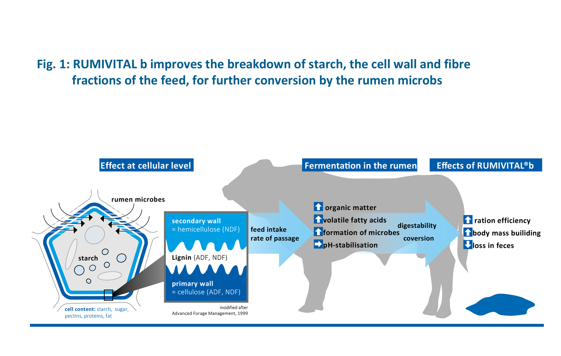RUMIVITAL®b improves the degradation of the cell wall and fibre fraction of the basic feed for further conversion by rumen microbes